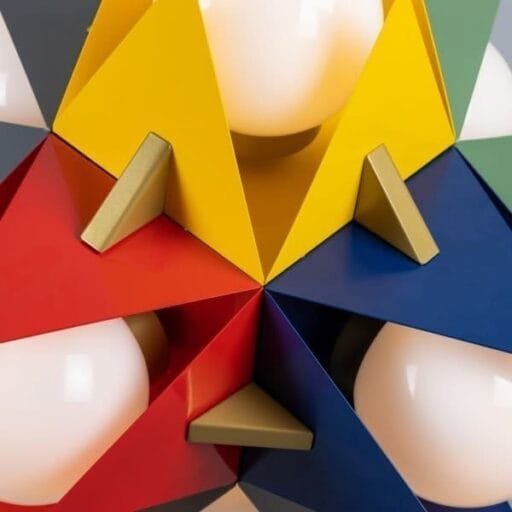 What makes the Bisbee chandelier stand out is its brilliant use of color and shape. Six meticulously crafted deconstructed pyramids intersect to create a striking angular structure. Nestled within this framework are six 15cm opal glass globes, which gently diffuse light to create a warm and welcoming ambiance. The geometric shapes are powder-coated in an array of vivid hues, including yellow, sage green, red, sapphire blue, bronze, and grey, adding a pop of color to any room. To complete the look, the ceiling rose and the suspension chain are finished in a soft golden tone, enhancing the overall sophistication of the piece.