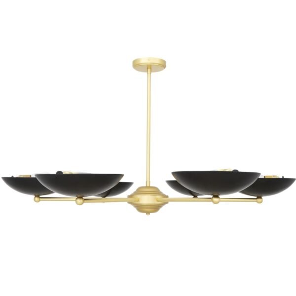 Each arm of the chandelier showcases a chic black metal shallow dome shade that artfully supports a lamp holder and bulb. The matte black shades are not just for aesthetic appeal; they are complemented by polished brass sleeves that enhance the chandelier’s overall modern design. Measuring 63cm in height and 102cm in diameter, the Newbury Chandelier is designed to suit various ceiling heights while offering ample lighting for your space.